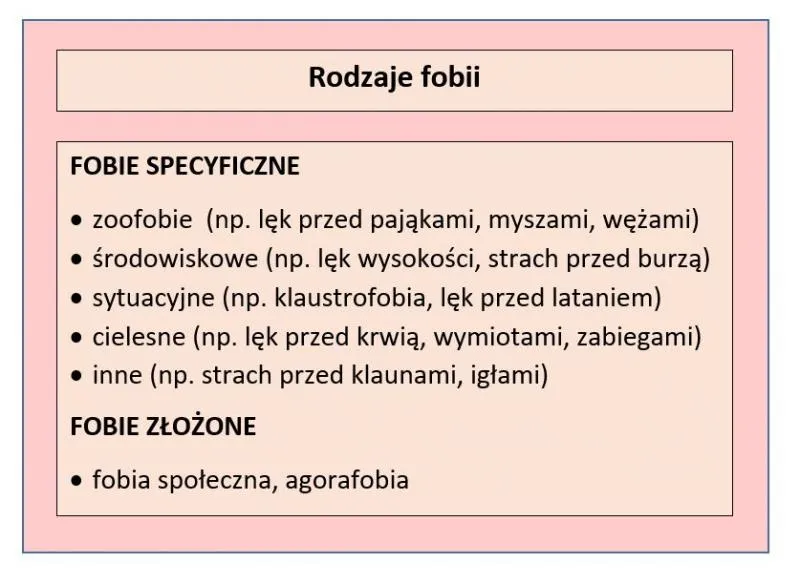 - Istnieją różne rodzaje fobii, w tym fobie specyficzne oraz fobia społeczna.